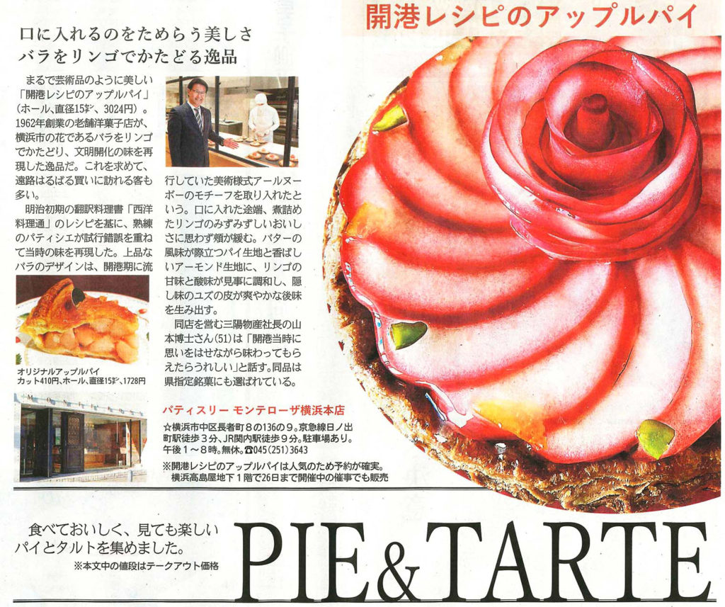 弊社のフラッグシップ店 パティスリーモンテローザ横浜本店の「開港レシピのアップルパイ」と「オリジナルアップルパイ」が、神奈川新聞「パイ&タルト特集」見開きカラーにて紹介されました。