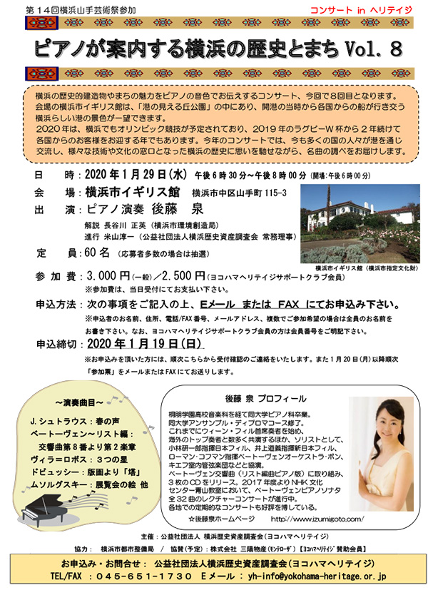このコンサートは、歴史的建造物等の保全活用を推進するために設立された民間団体「横浜史資産調査会(通称 YOKOHAMA HERITAGE ヨコハマヘリテイジ)」が主催で行われれています。ヨコハマヘリテイジは、「歴史的な資産を大切にし、活用することによってまちの魅力を創っていく」という趣旨のもと様々な活動を行っています。