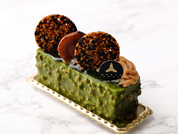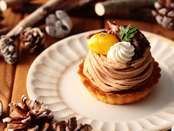 マロンムースの中にパッションゼリーの層とコーヒー&チョコレートムースを入れ、旬の甘栗をトッピングした「マロンショコラとパッションゼリー」、フランス老舗紅茶メーカーの「ジャルダン・ブルー」を使用した、甘い香りとビターなムースショコラを合わせたエレガントなケーキ「ジャルダン・ブルー」、オレンジの風味とゴマのチュイールをアクセントにした、京都産宇治抹茶を使用したオペラ仕立てのケーキ「雅(MIYABI)」。