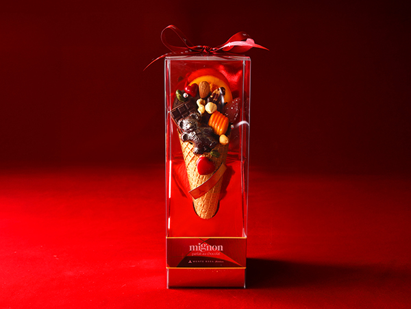 ワッフルコーンの色々なスイーツをトッピングした可愛らしいチョコパフェ「ミニョン」、
