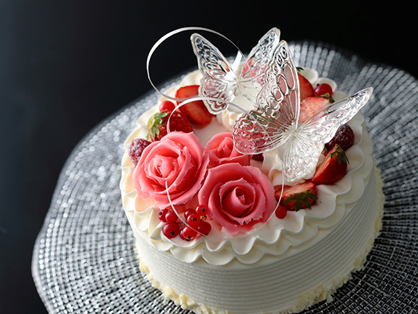 横浜を象徴するバラと、優雅に舞う蝶が美しくデコレーションされた庭園のようなケーキ「シャルマン・ローズ」は、八ヶ岳産のハーブ卵、北海道産生クリームなどこだわりの原材料を使用したスペシャルなケーキです。週末の素敵な時間の演出にぜひご利用ください。