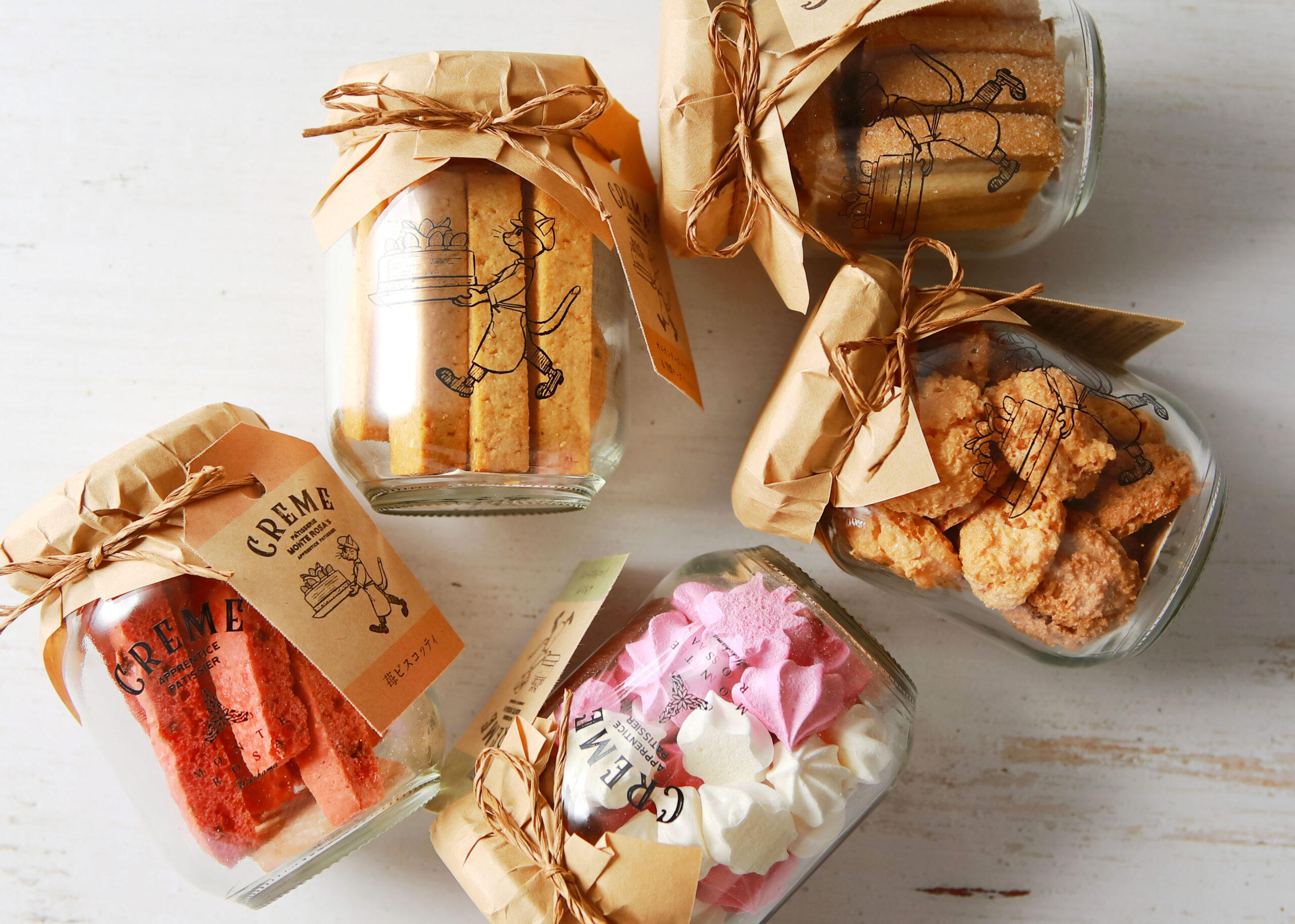 クレメとロゴがプリントされたガラス瓶にクッキーを詰めました。