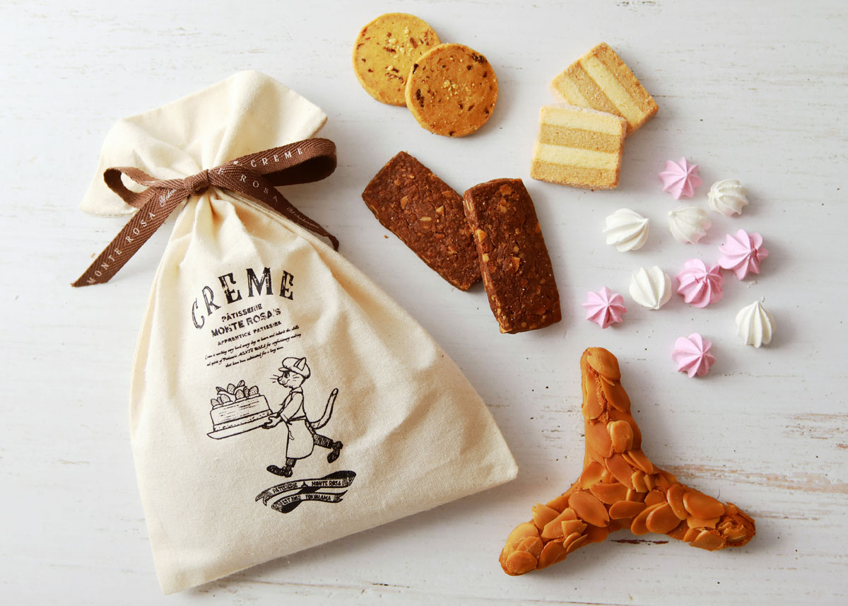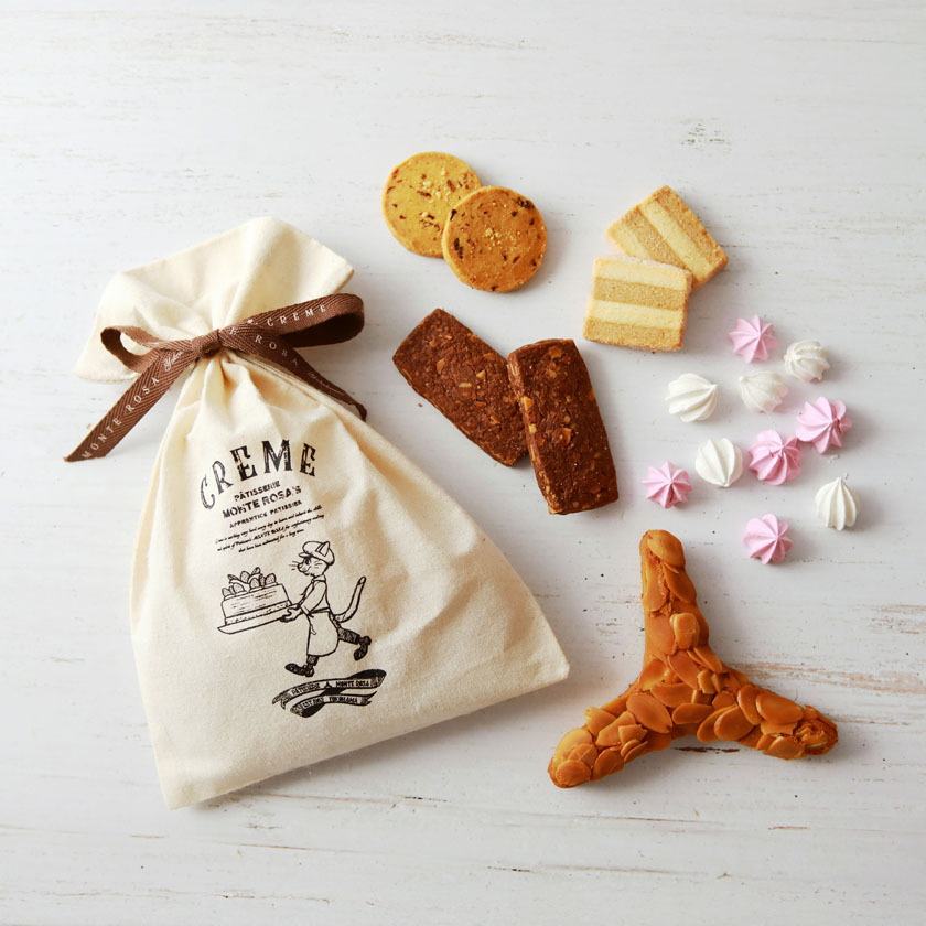 アンティークにデザインされたクレメのプリントが入ったコットン袋に、当店の横浜ロリケットやオニオンチーズサブレなど人気の焼き菓子をアソートしたスイーツバッグ。