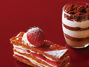 苺とカスタードクリームをたっぷり敷き詰め、バターで生地を包み込んだ贅沢なサクサクのパイ生地が自慢の「苺のミルフィーユ」とサクサクチョコクッキーとマスカルポーネムース、そこにエスプレッソコーヒーを合わせた「大人のティラミス」。