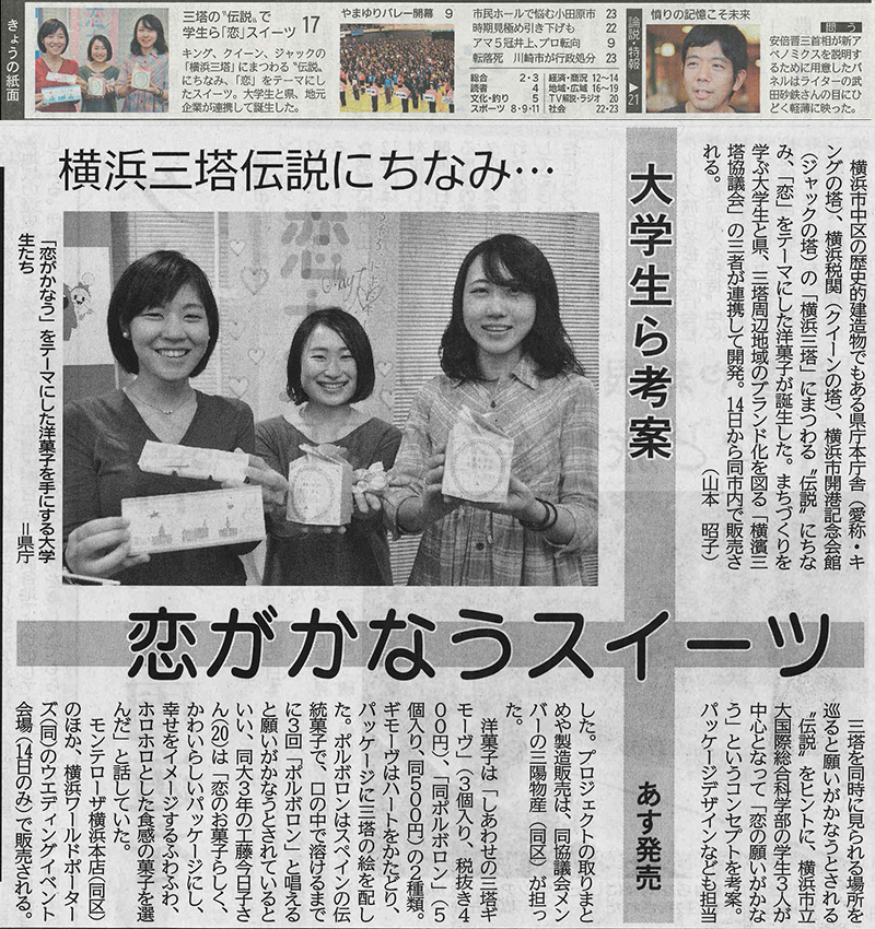昨日行われた神奈川県知事の定例会見において、MONTE ROSAを運営する株式会社 三陽物産が企画統括/製造販売を担当し、横浜市立大学と神奈川県の<恋カナ!プロジェクト>と<横濱三塔協議会>がコラボレーションしたスイーツ「しあわせの三塔ギモーヴ」と「しあわせの三塔ポルボロン」が発表されました。
