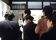 下:ミュージアム内で眞葛焼を鑑賞し解説を聞く院生の方々